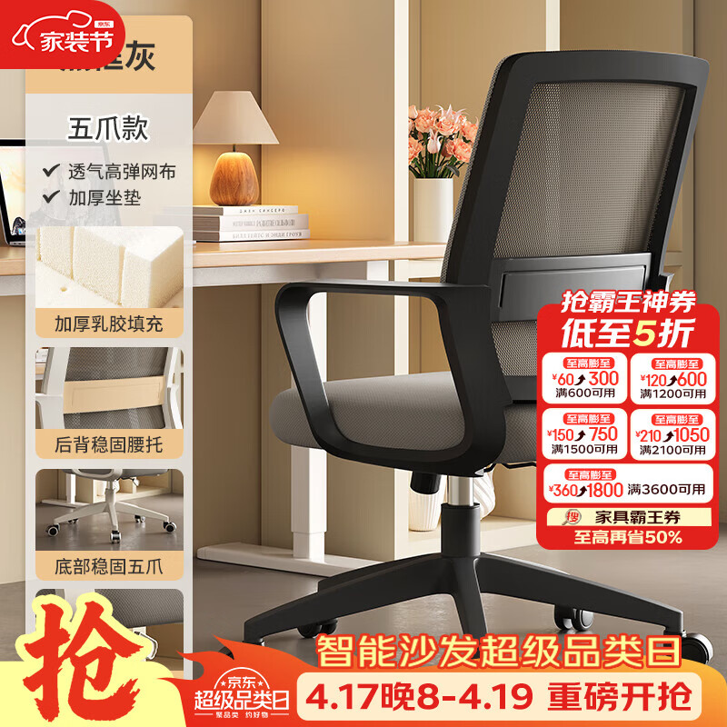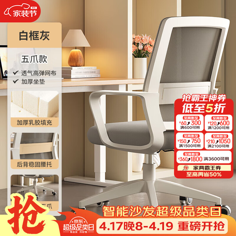 树浩电脑椅办公椅子舒适久坐靠背椅宿舍卧室学习座椅弓形电竞椅写字椅 【滑轮】乳胶+尼龙脚-白框灰网