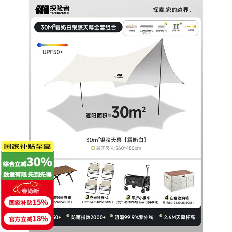 探险者(TAN XIAN ZHE)天幕帐篷露营天幕户外8-10人露营装备全套防晒蝶形防雨防风遮阳棚 【30㎡】银胶天幕全套组合