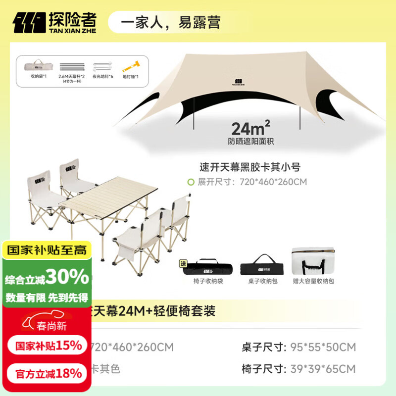 探险者(TAN XIAN ZHE)露营桌椅露营装备全套一体户外桌椅套装便携折叠桌子四椅子野餐桌 【95CM】轻便椅套装+速搭黑胶天幕24M