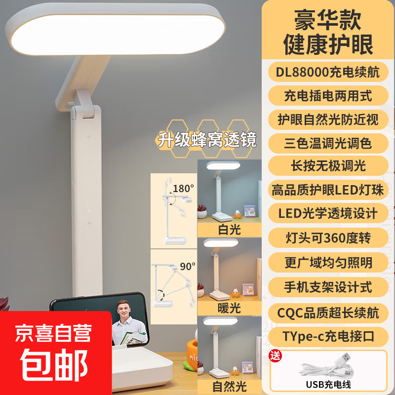 折叠式充电LED护眼台灯宿舍书房学习灯卧室床头灯小夜灯礼品台灯 豪华款-折叠台灯【充插两用】三档调色调光