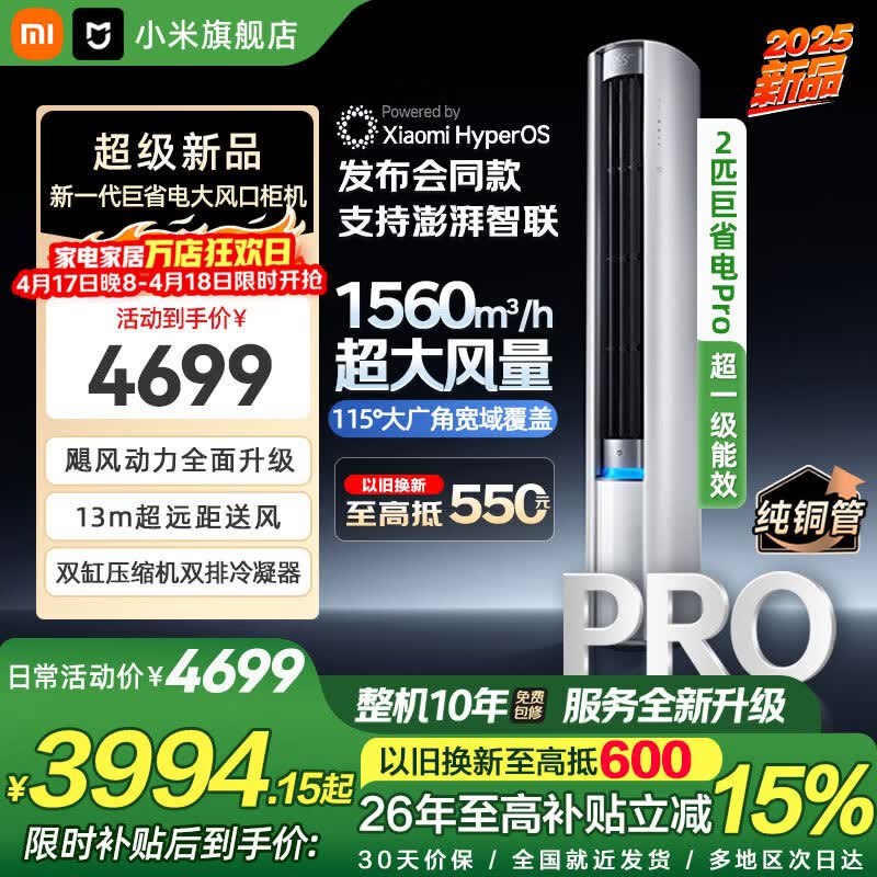 小米(MI)空调米家 2匹柜机 新一级能效 巨省电Pro 大风口 变频冷暖 客厅温湿双控 立式智能圆柱柜机 巨省电pro 2匹 APF5.2 双排冷凝器