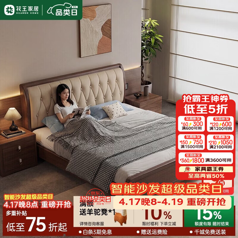 花王胡桃木实木床新中式真皮软包双人床W2208#床1.8米x2米
