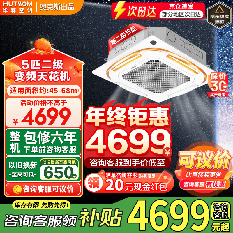 华蒜空调奥克斯出品 大3匹/大5匹新能效变频冷暖 天花机吸顶机天井商用一拖一嵌入式中央空调 旗舰款 大5匹 二级能效 爆款省电【变频45-68平】220v