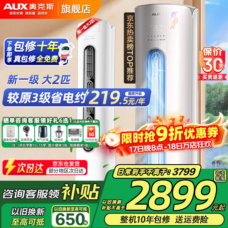 奥克斯(AUX)大3匹新一级三级能效柜机空调立式2P 家电补贴20% 变频冷暖省电 自清洁高温除菌立柜式空调 大2匹 一级能效 【省电自清洁圆柜】23-34平 【强劲冷暖 除菌自清洁】