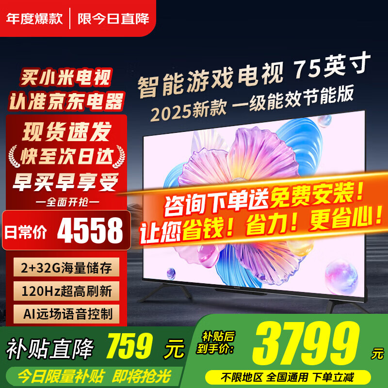 小米(MI)电视75英寸2025款液晶平板电视机一级能效4K超高清红米Redmi家用客厅HDR智能投屏游戏彩电以旧换新 75英寸 【省心包安装】小米Redmi+上门安装