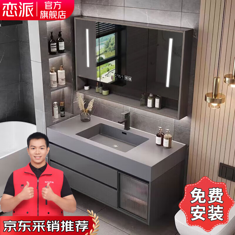 恋派实木浴室柜岩石一体洗脸盆组合卫生间洗漱台陶瓷一体洗手盆柜组合 智能半镜120cm+岩石一体盆 默认赠黑方龙头配件