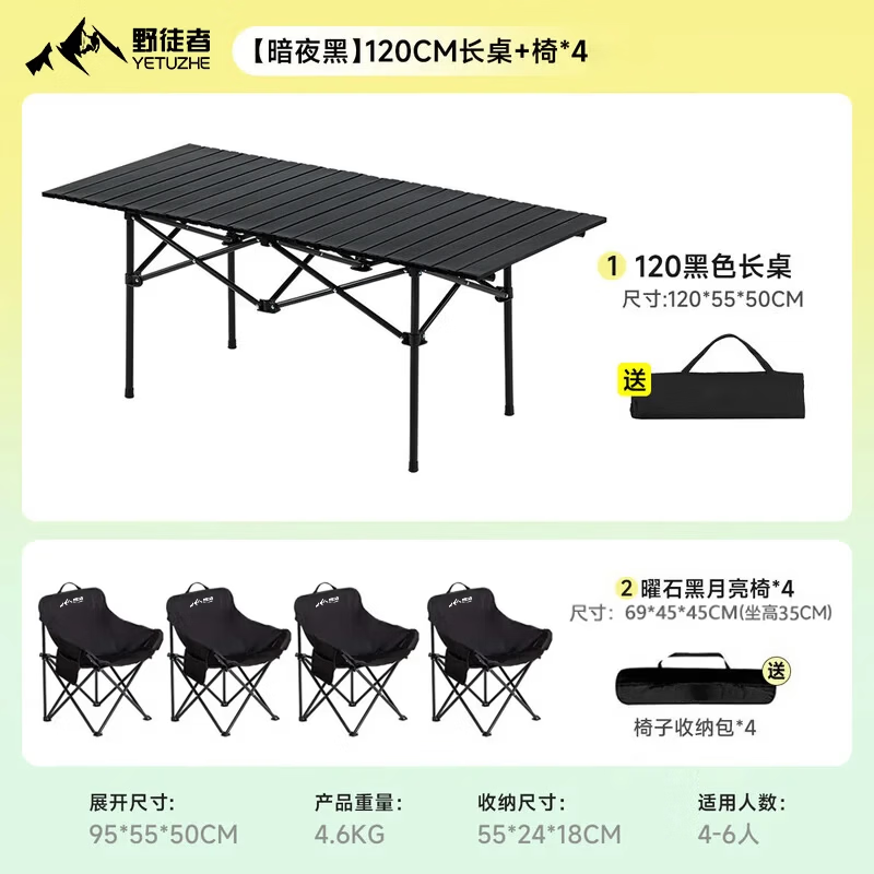 野徒者露营桌椅全套户外桌椅折叠椅野餐一桌四椅户外露营装备野炊蛋卷桌 120折叠桌+4黑色月亮椅 新款升级