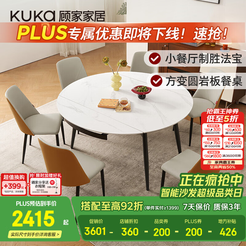 顾家家居简约岩板餐桌饭桌子家用可伸缩全托小户型餐桌椅子全套DS7209哑光 【雪山石哑光】1.35M餐桌+折线橙椅*6