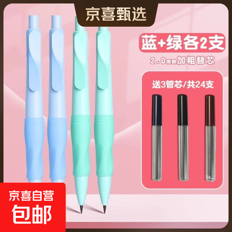 正姿自动铅笔小学生专用一年级活动自动笔儿童2点0高颜值初中生2b铅笔按动不用削的初学者笔芯铅芯 【蓝+绿】4支+3盒(送24支替芯)