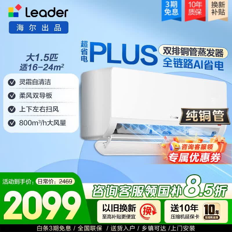 海尔空调出品统帅新1级纯铜管超省电大1.5匹AI智能挂机空调 大风量防直吹卧室冷暖两用空调 以旧换新 【双排铜管蒸发器】超省电plus|柔风双导板