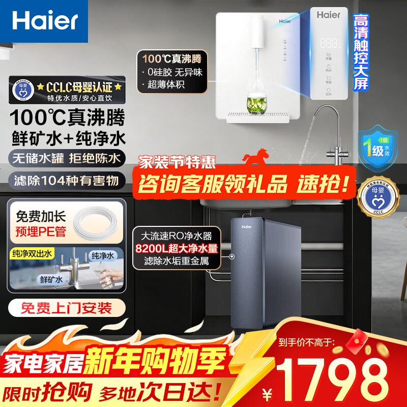 海尔净水器母婴认证家用厨下式RO反渗透纯水机管线机即热式直饮加热一体机餐边柜自来水过滤器套装 净水器+超薄管线机