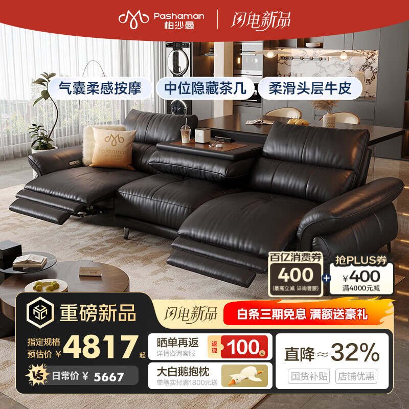 帕沙曼零靠墙客厅轻奢高级感2026新款真皮直排翻倒几按摩电动沙发GF503C 【双电动】2.77多人位 【单按摩+翻倒几|舒享版】 柔感按摩|中位隐藏茶几