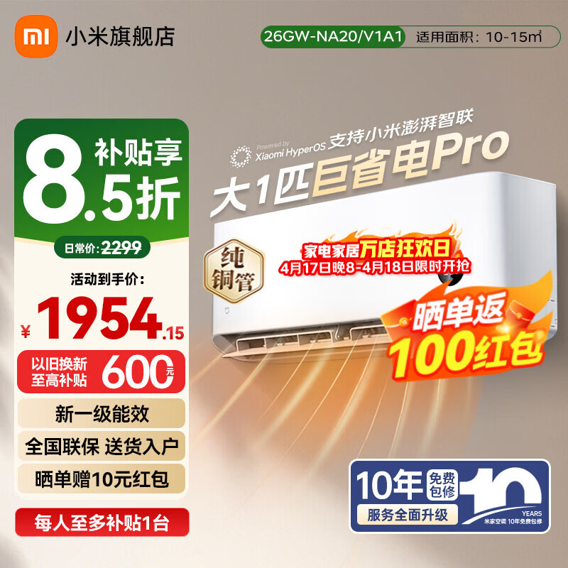 小米(MI)空调1.5匹 巨省电 新一级能效 变频冷暖智能自清洁壁挂式空调挂机26年双排纯铜管 十年质保 巨省电pro 大1匹 26GW-NA20/V1A1