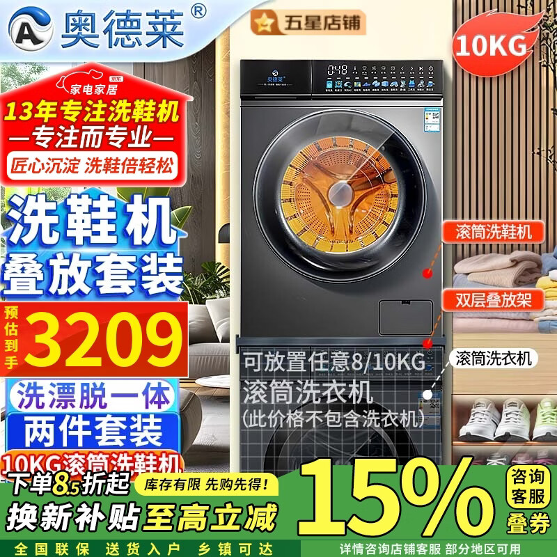 奥德莱(AOD)【补贴85折】滚筒洗鞋机全自动洗脱一体烘干家用刷鞋机洗鞋子神器专业自动洗鞋机洗烘一体免拆鞋带 10KG非烘干洗鞋机-灰色+双层叠放架