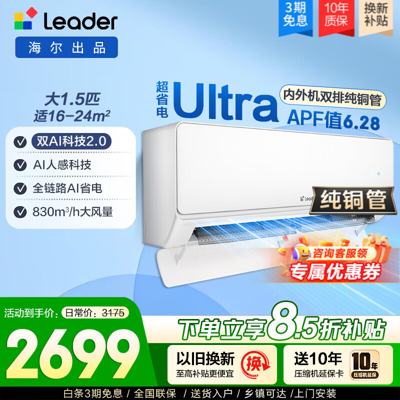 海尔空调出品统帅新1级纯铜管超省电大1.5匹AI智能挂机空调 大风量防直吹卧室冷暖两用空调 以旧换新 【新品双排冷凝器】超省电ultra|AI人感科技