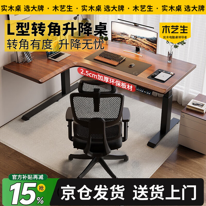 木藝生转角双电机电动升降电脑桌家用办公双人L型桌子工作台拐角书桌 【双电机3节】整板右拐角胡桃色 覆膜板材 1.8*1.1M(升级加强版收纳横梁)