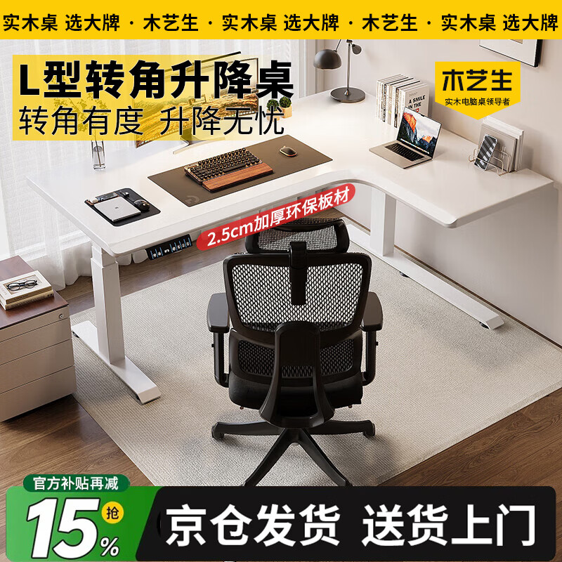 木藝生转角双电机电动升降电脑桌家用办公双人L型桌子工作台拐角书桌 【双电机2节插排款】左拐角3cm实木雅致白 1.4*1.1M(升级加强版收纳横梁)