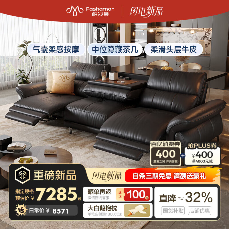 帕沙曼零靠墙客厅轻奢高级感2026新款真皮直排翻倒几按摩电动沙发GF503C 【双电动】3.04多人位 【双按摩+翻倒几|舒享版】 柔感按摩|中位隐藏茶几
