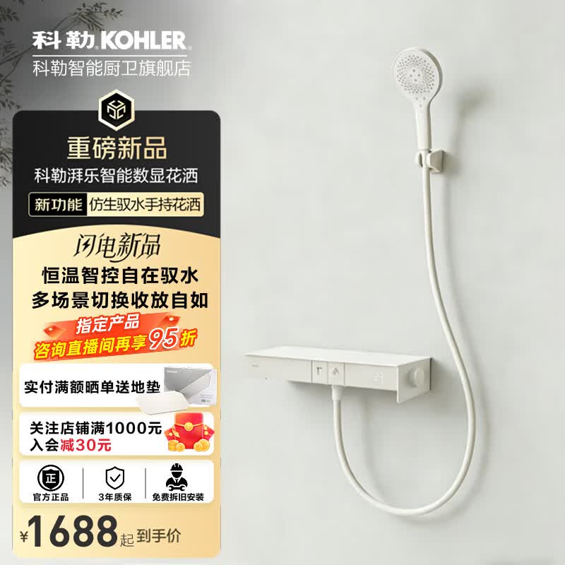 科勒(KOHLER)恒温花洒家用淋浴花洒套装湃乐SH10手持花洒套装带浴缸龙头 雨神智能数显花洒39729T(云缎沙色)