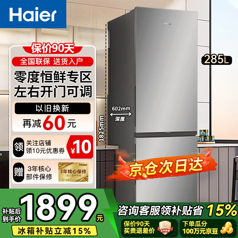 海尔冰箱双开门风冷无霜家用冰箱小型一二门新等级能效冷藏冷冻两用1一2人节能省电出租房小户型冰箱 285升一级能效风冷无霜智能家用冰箱