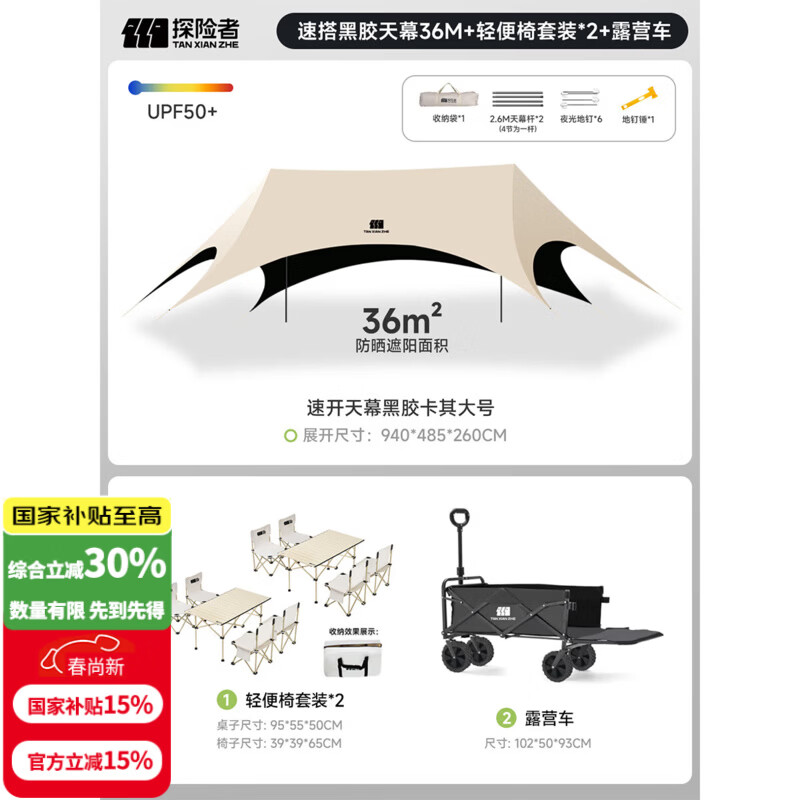 探险者(TAN XIAN ZHE)天幕帐篷户外露营车载便携六角防晒速开懒人天幕野营遮光遮阳棚 【轻便露营】36㎡天幕+轻便椅套装+推车