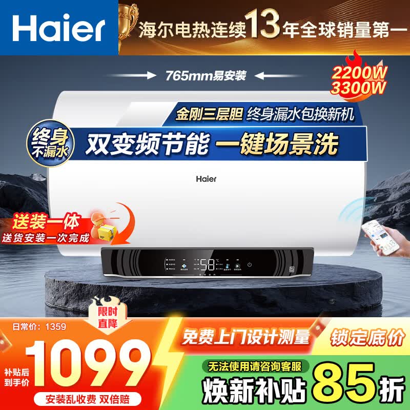 海尔(Haier)电热水器家用60升80升洗澡上门安装储水式一级能效免换镁棒金刚无缝胆节能双管变频 60L 3300W 双管变频/一键场景洗/JL3