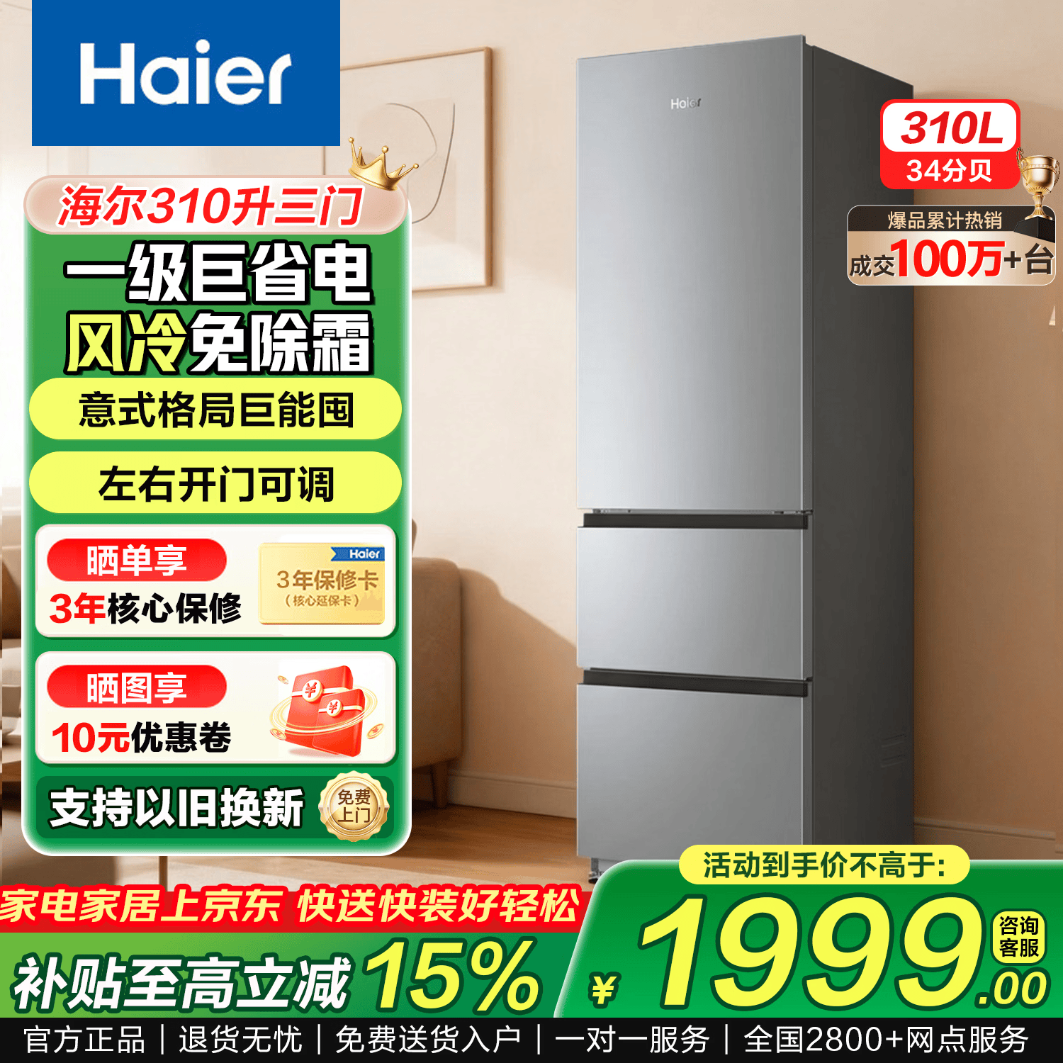海尔(Haier)冰箱家用三开门风冷无霜超薄两天约一度电新等级能效小冰箱小户型节能省电冰箱以旧换新补贴 310升银|一级能效|风冷无霜|除菌|左右开门