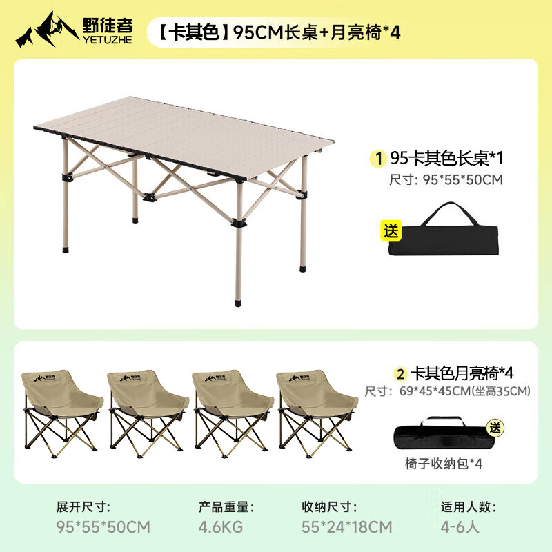 野徒者露营桌椅全套户外桌椅折叠椅野餐一桌四椅户外露营装备野炊蛋卷桌 95折叠桌+4白色月亮椅 新款升级