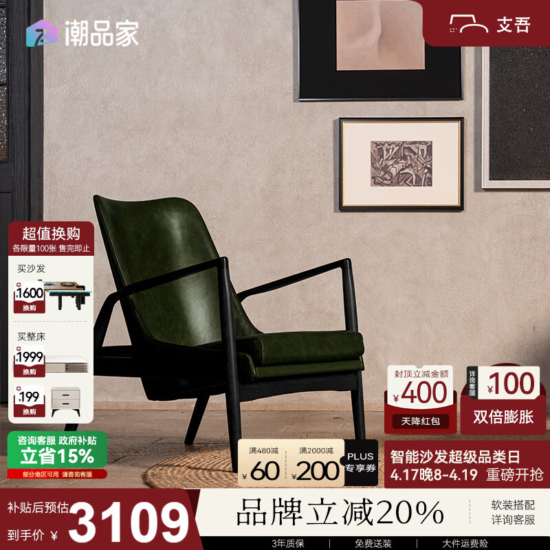 支吾琥珀椅中古风客厅单人位设计师复古油蜡皮真皮休闲椅 雪松绿+黑