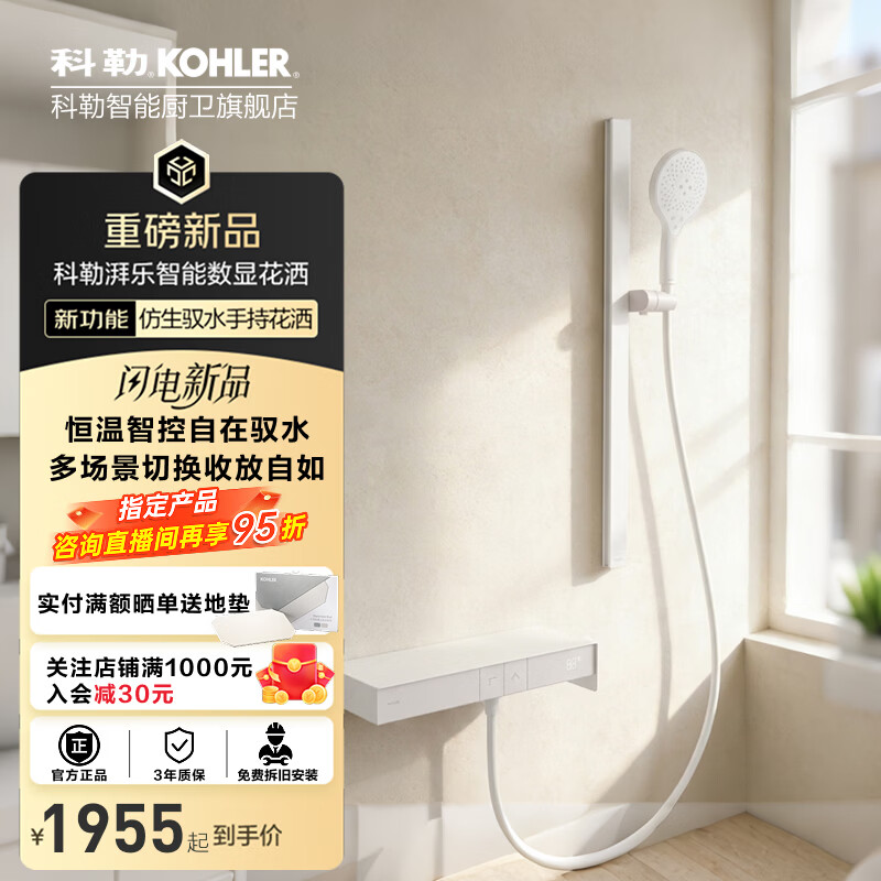 科勒(KOHLER)恒温花洒家用淋浴花洒套装湃乐SH10手持花洒套装带浴缸龙头 雨神智能数显花洒41177T-带支架(云缎沙色)