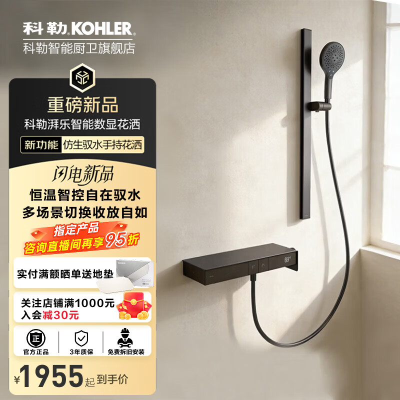 科勒(KOHLER)恒温花洒家用淋浴花洒套装湃乐SH10手持花洒套装带浴缸龙头 雨神智能数显花洒41177T-带支架(墨影灰色)