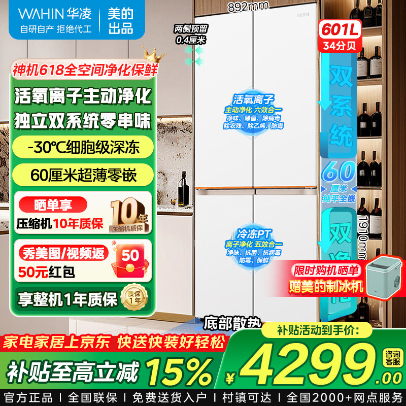 美的(Midea)出品华凌冰箱十字对开门双开门多门一级能效双变频风冷无霜家用四开门冰箱426/525/520 十字618丨双系统超薄零嵌