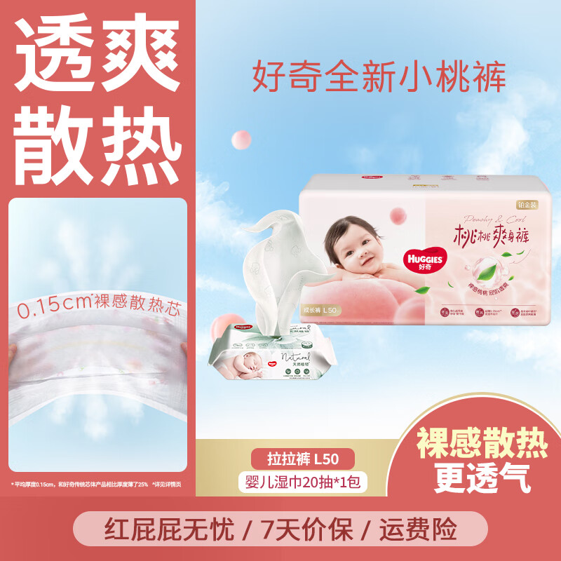 好奇(Huggies)铂金装成长裤婴儿拉拉裤小桃裤夏日超薄透气 L50片(9-14kg)+湿巾1包