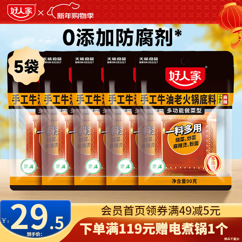 好人家0添加香辣牛油火锅底料煮火锅冒菜麻辣烫小块分装露营便携调料 手工火锅90g*5【一料多用】