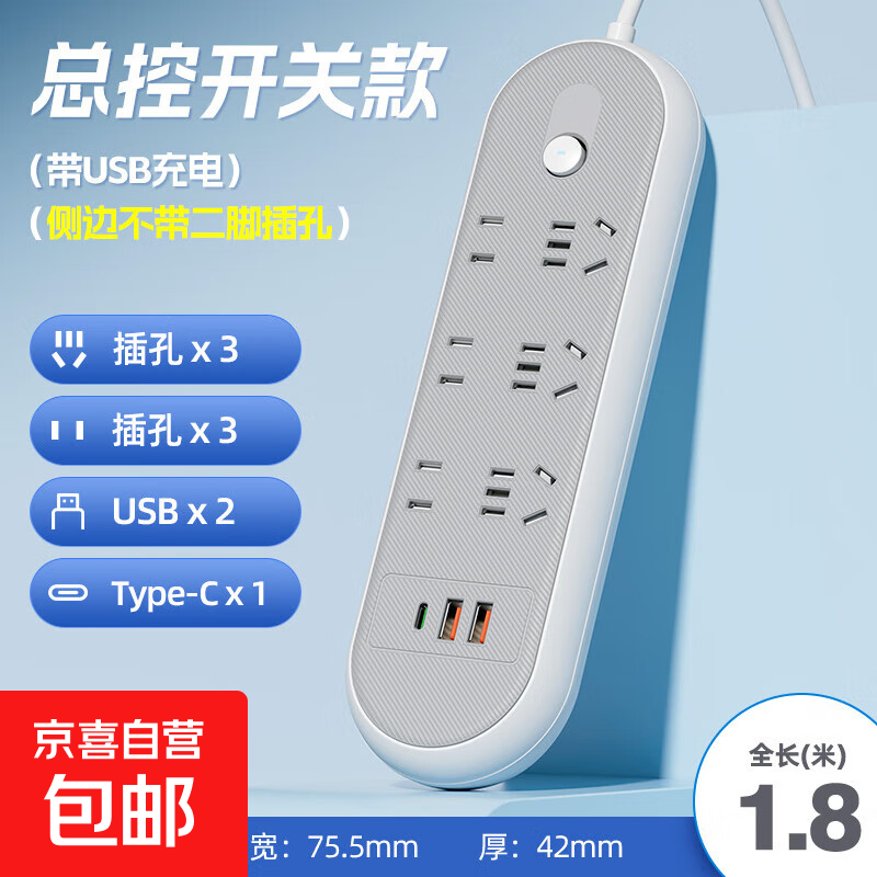【京东物流】家用插座正品带usb插排插线板多功能排插接线板插板带线大功率 高贵灰-21孔3USB 1.8米【普通款款】
