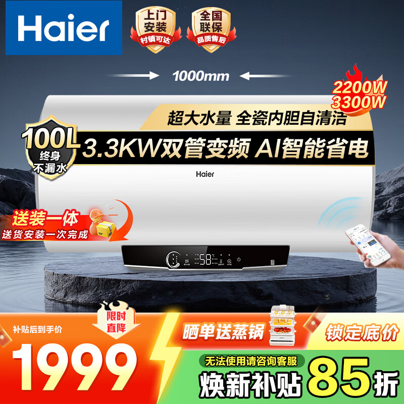 海尔(Haier)电热水器家用60升80升洗澡上门安装储水式一级能效免换镁棒金刚无缝胆节能双管变频 100L 3300W 超大水量/双管变频/锆金全瓷