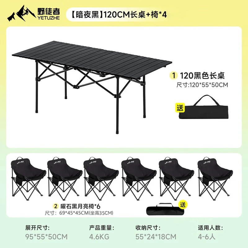 野徒者露营桌椅全套户外桌椅折叠椅野餐一桌四椅户外露营装备野炊蛋卷桌 120折叠桌+6黑色月亮椅 新款升级
