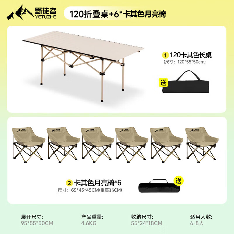 野徒者露营桌椅全套户外桌椅折叠椅野餐一桌四椅户外露营装备野炊蛋卷桌 120折叠桌+6白色月亮椅 新款升级