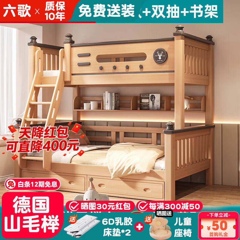六歌德国山毛榉全实木上下铺双层子母成年大人两层床儿童多功能高低床 爬梯款+书架+双抽+6D乳棕床垫*2 上铺宽120*下铺宽150