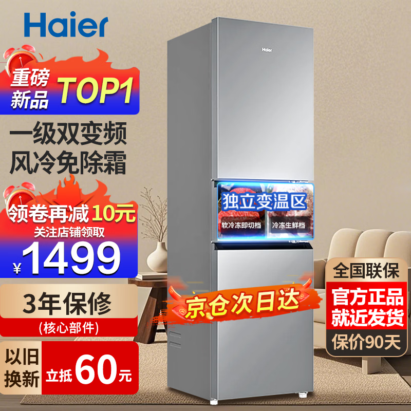 海尔冰箱三开门家用冰箱小型风冷无霜一新等级能效出租房小冰箱以旧换新超薄电冰箱海尔智家出品Leader 217升三门冰箱一级能效风冷无霜