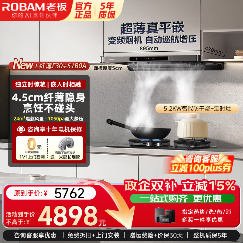 老板(Robam)【升级款F30】60A0S油烟机燃气灶套装 家用欧式顶吸直流变频巡航24大风量烟机灶具套装 以旧换新 【防干烧+定时】F30+防干烧定时灶51B0A