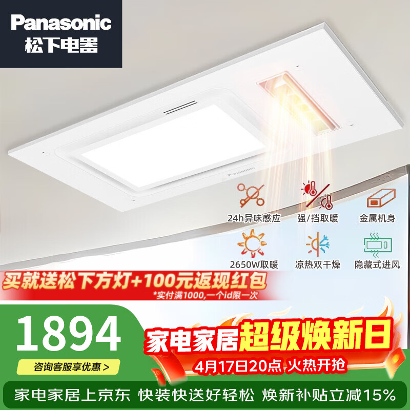 松下浴霸暖风照明排气一体集成吊顶暖风机浴室卫生间石膏板超薄取暖器 8平内|FV-JDBQVU1异味感应/照明