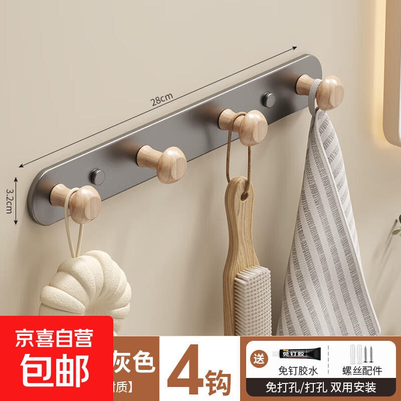 挂钩免打孔强力粘胶墙壁壁挂卫生间浴室厨房门后衣服毛巾衣架墙上 蘑菇头挂钩-枪灰款4钩【圆润不伤衣】