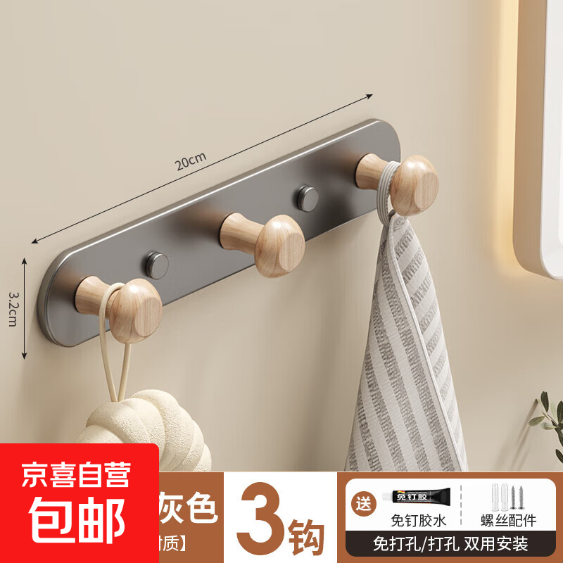 挂钩免打孔强力粘胶墙壁壁挂卫生间浴室厨房门后衣服毛巾衣架墙上 蘑菇头挂钩-枪灰款3钩【圆润不伤衣】