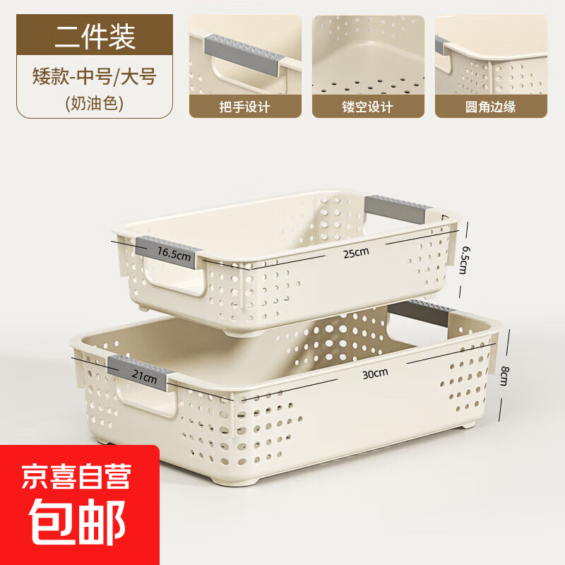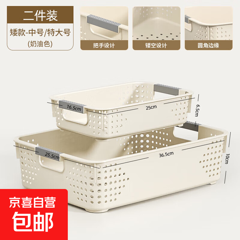 杂物收纳筐塑料桌面收纳盒厨房橱柜零食玩具整理筐置物塑料收纳篮 奶油色矮款中号+矮款大号