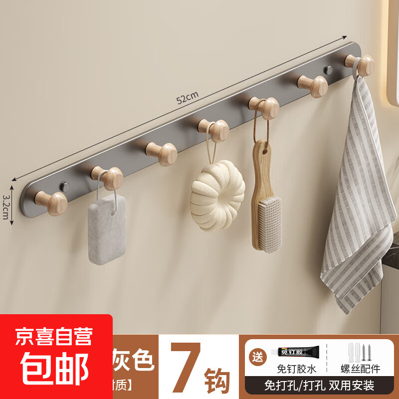 挂钩免打孔强力粘胶墙壁壁挂卫生间浴室厨房门后衣服毛巾衣架墙上 蘑菇头挂钩-枪灰款7钩【圆润不伤衣】