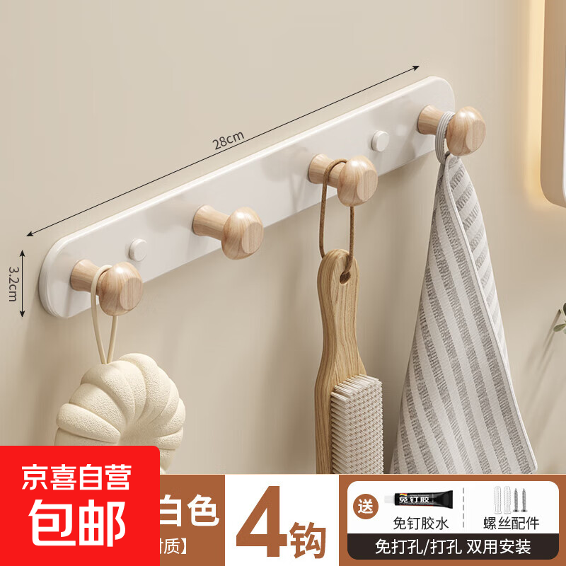 挂钩免打孔强力粘胶墙壁壁挂卫生间浴室厨房门后衣服毛巾衣架墙上 蘑菇头挂钩-奶白款4钩【圆润不伤衣】