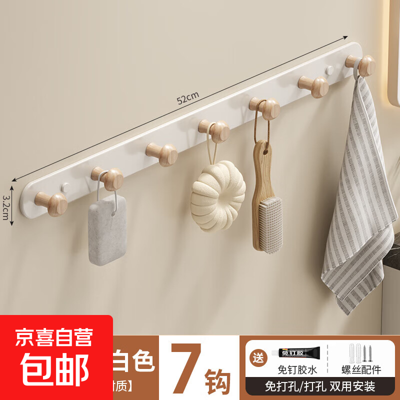 挂钩免打孔强力粘胶墙壁壁挂卫生间浴室厨房门后衣服毛巾衣架墙上 蘑菇头挂钩-奶白款7钩【圆润不伤衣】