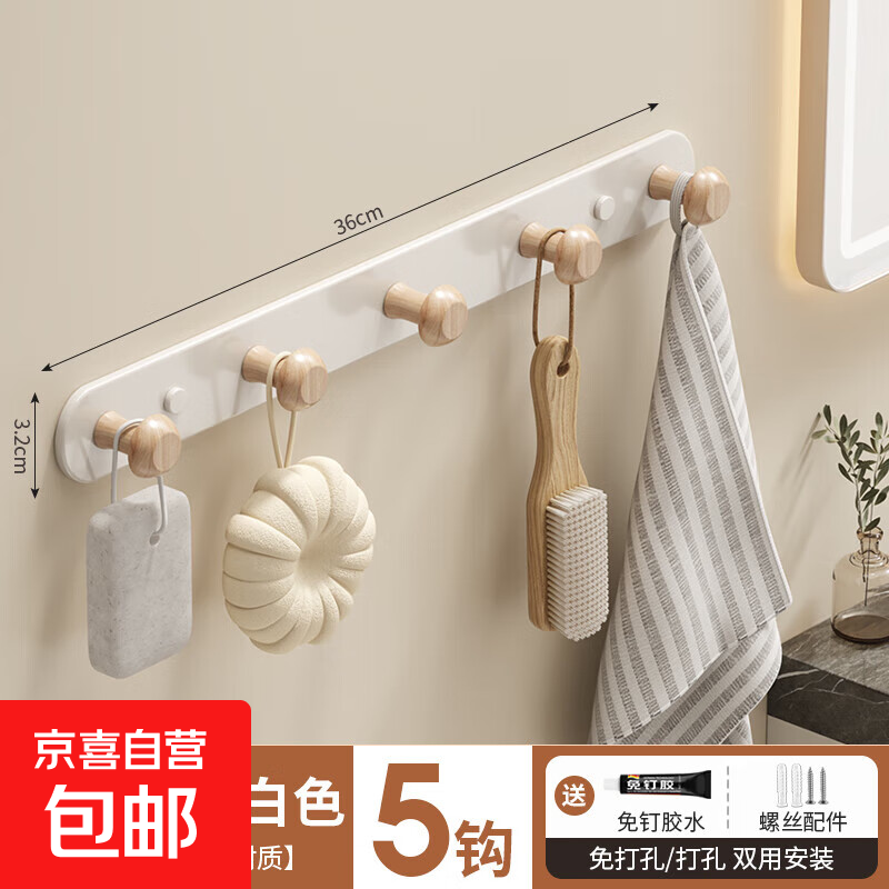 挂钩免打孔强力粘胶墙壁壁挂卫生间浴室厨房门后衣服毛巾衣架墙上 蘑菇头挂钩-奶白款5钩【圆润不伤衣】