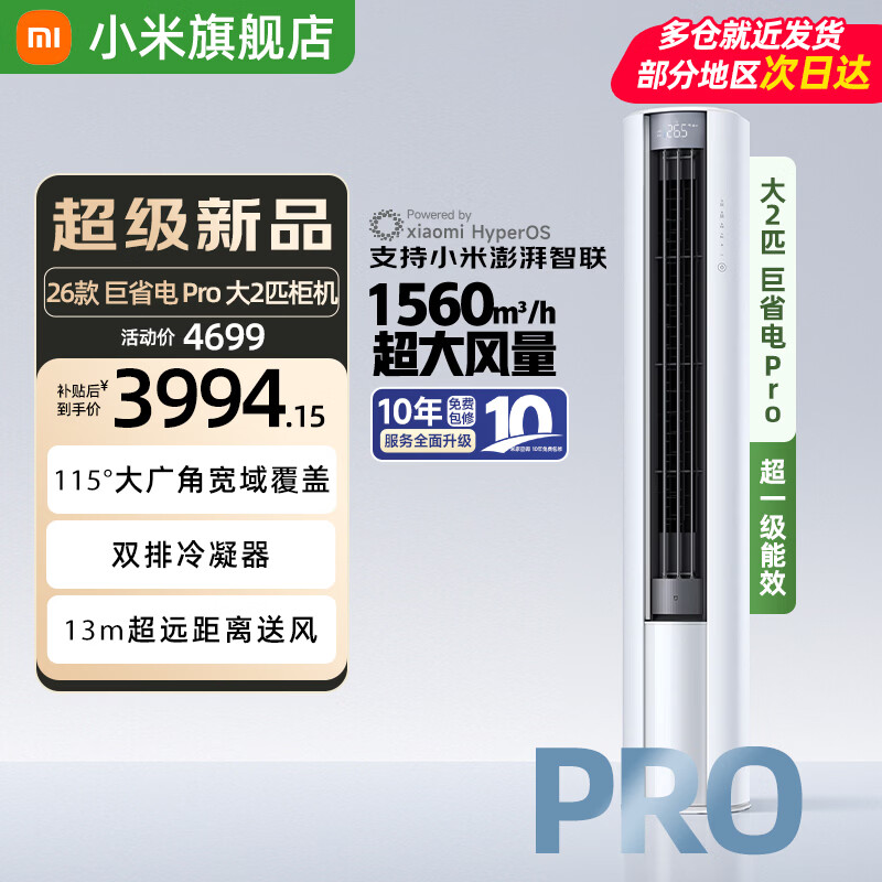 小米(MI)米家空调 3匹 巨省电pro柜机 新能效冷暖变频 智能互联 自清洁 立式客厅家用2匹空调 大2匹 一级能效 巨省电pro【26款新品】